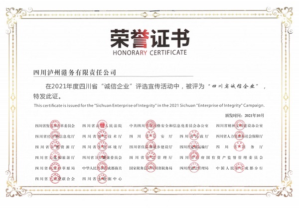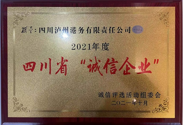 诚实守信,榜样先行。近期,四川省发展改革委等25部门联合发布2021年度 “诚信企业”评选结果,泸州港务公司成功获评2021年度“四川省诚信企业”。
